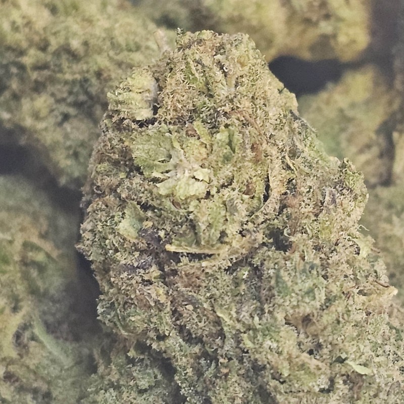 Sa robe verte lumineuse, parsemée de pistils dorés, témoigne d’une culture soignée et d’une forte concentration en résine naturelle.